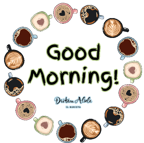 An animated sticker featuring a circular array of coffee cups, latte art, and the text 'Good Morning!' by Dritan Alsela, IL BARISTA.