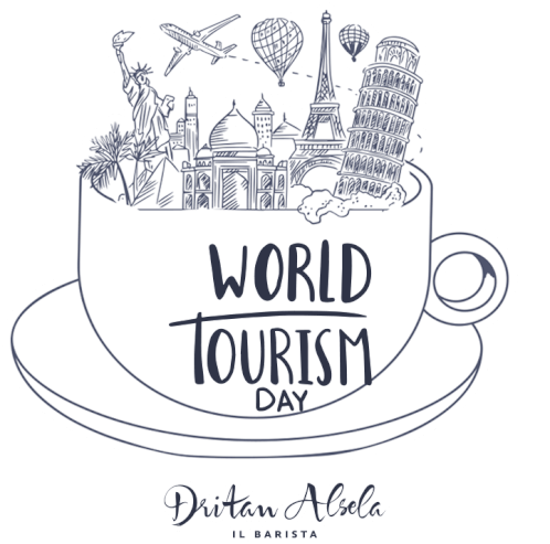 A Dritan Dritanalsela sticker for World Tourism Day, featuring a coffee cup overflowing with global landmarks.