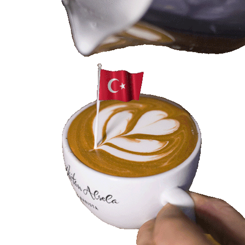 Dritan Alsela's expert latte art featuring a heart design and a Turkish flag in a coffee cup.