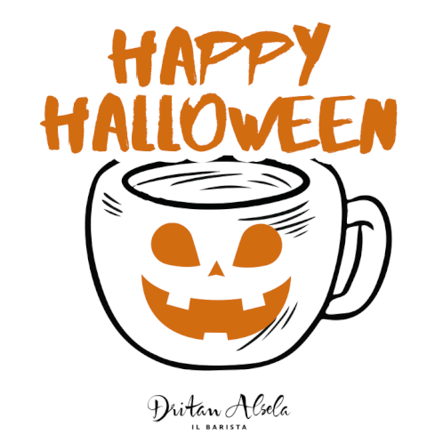 Happy Halloween coffee cup with a jack-o'-lantern face and a spiderweb, featuring Dritan Alsela's signature.