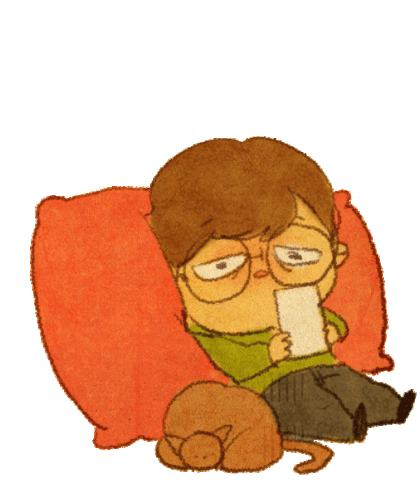 A charming Puung character, wearing glasses, falls asleep while reading, dropping their device next to a sleeping cat.
