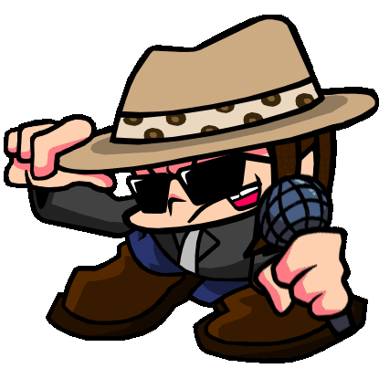 Dross Down Complete pixel art man in a hat and sunglasses holding a microphone, moving his head.