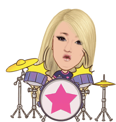 An animated drummer girl with blonde hair enthusiastically plays a purple drum set, hitting the cymbals and drums.