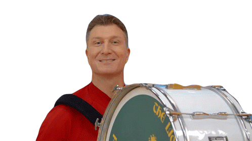 Simon Pryce from The Wiggles energetically plays a large bass drum, smiling and making a fun sound.