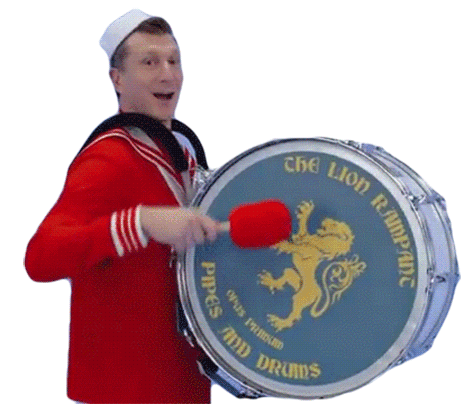 Simon Wiggle, dressed in a red sailor suit, happily plays a large bass drum with a red mallet, smiling at the camera.