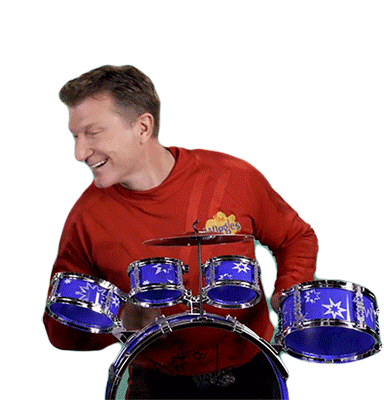 Simon Pryce, the Red Wiggle, smiles while playing a blue toy drum set.