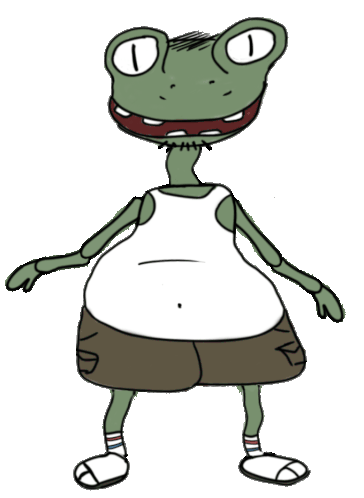 A quirky cartoon frog, appearing tipsy, walks with a wide grin, wearing a white tank top and brown cargo shorts.
