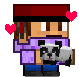 Dryter, a pixel art character, lovingly holds a cute panda, with animated pink hearts appearing on their hat.