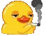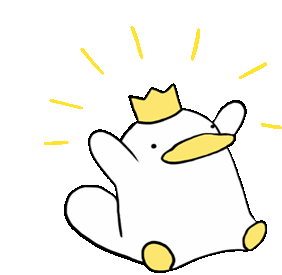 An excited cartoon duck exclaims 'Yeah~~' with raised arms, then proudly holds a small yellow crown.