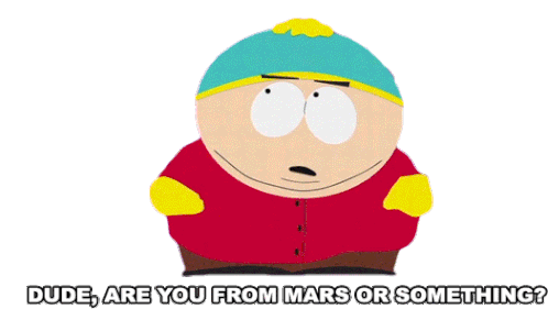 Eric Cartman from South Park asks, "Dude, are you from Mars or something?" with a classic exasperated expression.