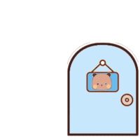 Dudu, the cute cartoon bear, is visibly angry and unhappy on a sign hanging on a light blue door, signaling 'get lost' or 'out'.