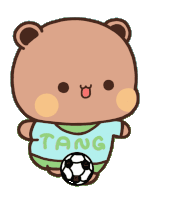 Cute Dudu Du bear character winks and smiles while holding a soccer ball, wearing a 'TANG' shirt.