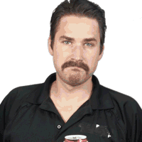 A man with a prominent mustache holds an Old Milwaukee can, looking directly at the viewer with a slight smirk.