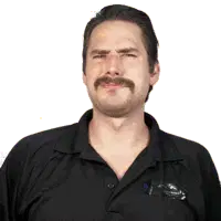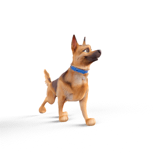 Duke Champion, an animated German Shepherd dog, blinks and walks with a blue collar and tag.