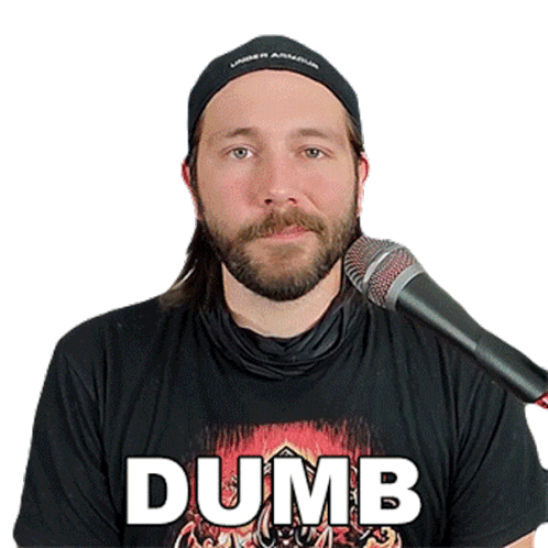 Michael Kupris speaks into a microphone, with the word 'DUMB' displayed on screen, conveying a strong opinion.