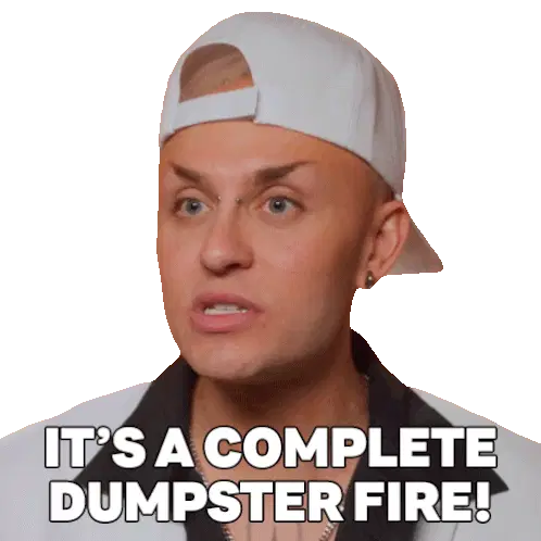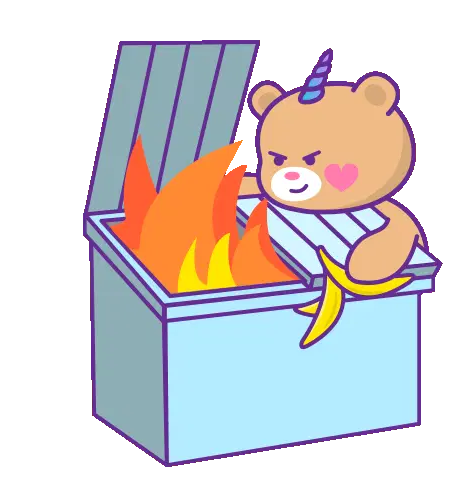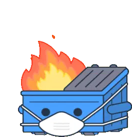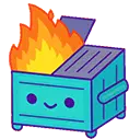 A green dumpster with "Farlopa" written on it, engulfed in red and yellow flames, featuring a cute smiling face.