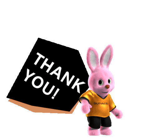The iconic Duracell Bunny joyfully expresses gratitude with a 'Thank You!' sign and energetic movements.