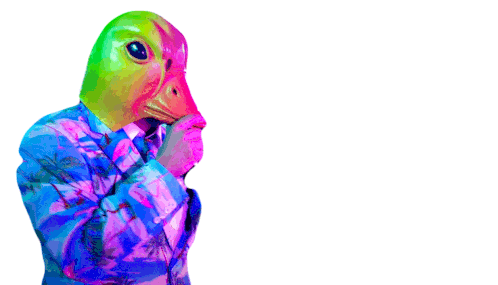 Ingo Onhe Flamingo, a character in a duck mask, cheers 'Prost Düsseldorf' in a vibrant, animated sticker.