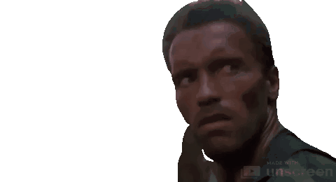 Dutch (Arnold Schwarzenegger) from Predator looks around intensely, then reacts with surprise. A classic movie moment.
