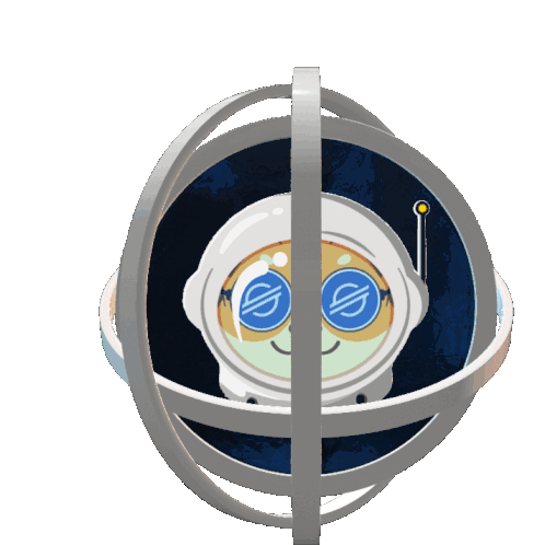 Animated 3D logo of Doge Lumens (Dxlm) featuring a doge in an astronaut helmet, spinning within a gyroscope.