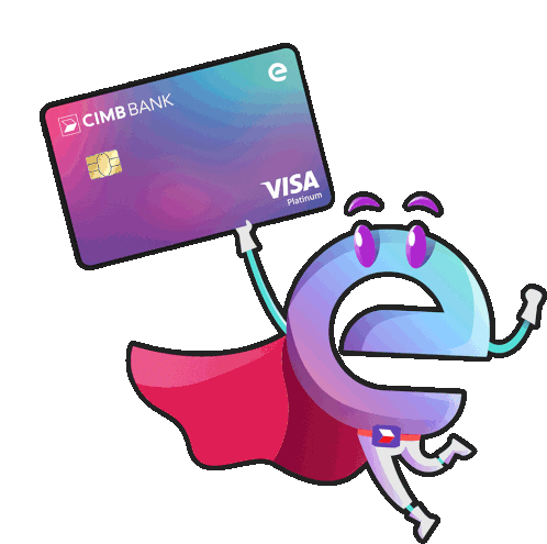 An animated 'e' character, wearing a superhero cape and a Philippine flag, flies triumphantly with a CIMB Bank Visa Platinum card.