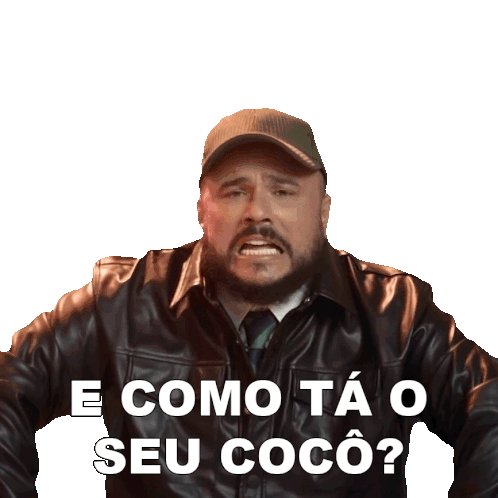 Brazilian comedian Ed Gama asks 'And how is your poop?' in a humorous and direct manner, wearing a hat and leather jacket.