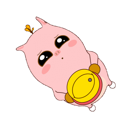 A cute pink pig-like character lies down, holding a yellow bell, expressing a feeling of longing or wanting.