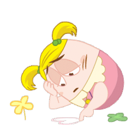 Eagers, a cute cartoon girl with blonde pigtails, lies thoughtfully, appearing to wish for something.