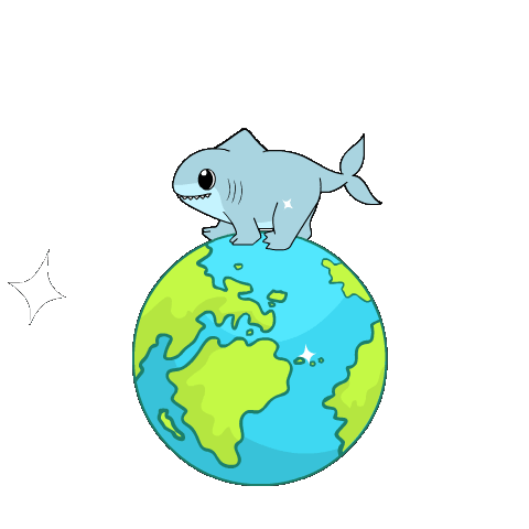 A cute, animated land shark happily walks around a spinning Earth, with sparkling effects appearing around the globe.