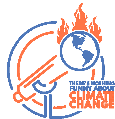Animated sticker showing a burning Earth and a saw cutting trees, emphasizing "There's Nothing Funny About Climate Change."