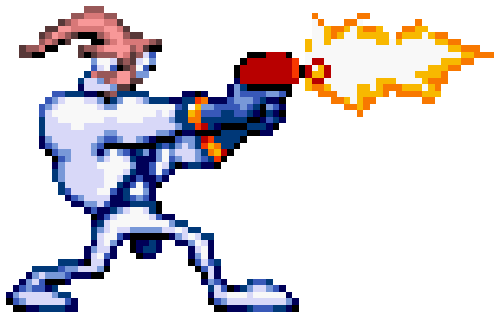 Earthworm Jim, the iconic video game character, stands ready with his blaster in this animated pixel art sticker.