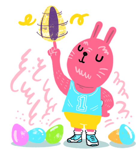 A pink Easter bunny in a basketball jersey skillfully spinning a large decorated egg on its finger.