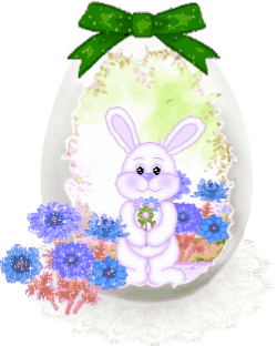 A cheerful Easter bunny winks happily while holding a decorated egg, perfect for sending festive greetings.