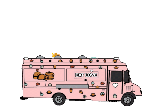A charming pink food truck with 'EAT LOVE' on its side, surrounded by various delicious floating food items.