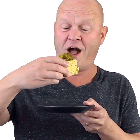 A bald man enthusiastically eats a piece of Cowboy Candy, a chili pepper delicacy, from a small black plate.
