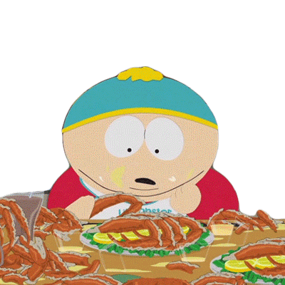 Eric Cartman from South Park indulges in a massive crab feast, happily devouring seafood with gusto.