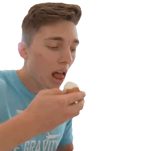 Brandon William, a young man in a blue shirt, is seen taking a bite out of a hard-boiled egg, enjoying his breakfast.