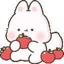 A cute cartoon bunny with pink cheeks happily eats a red apple, surrounded by more apples.