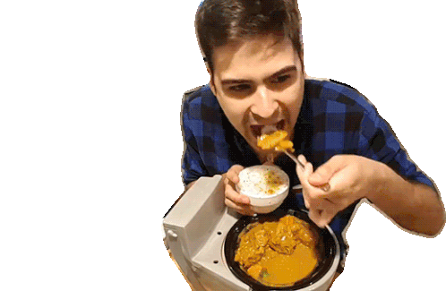Fabio Torres enjoys a hearty meal of curry and rice, scooping food from a bowl with a spoon and eating with gusto.