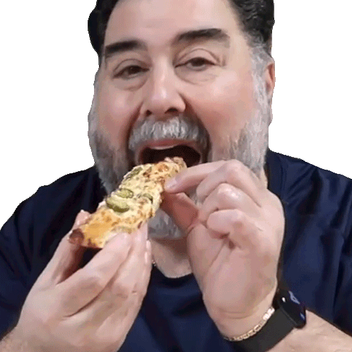 Chris Frezza enjoying a bite of Italian cheese stix, savoring the flavor with a satisfied expression.