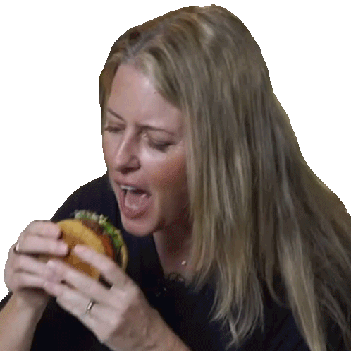 Jill Dalton takes a massive, hungry bite of a burger, showing her intense focus on the delicious meal.