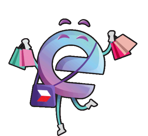 A happy 'e' character joyfully carries shopping bags, celebrating online deals and promotions with a cheerful vibe.