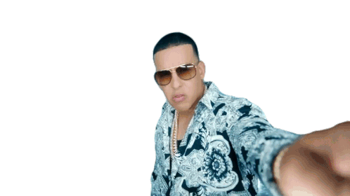 Daddy Yankee, wearing sunglasses and gold chains, looks directly at the viewer, inviting them to take a look.
