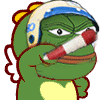 Pepe Qoobee, the ếchlaiong frog, wearing a helmet and holding a striped object, ready for action.