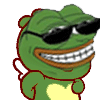 Pepe Qoobee, the green frog, winks and smiles broadly while wearing cool black sunglasses, exuding a cheerful and confident vibe.