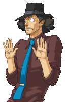 Eddie Fender from Ace Attorney Investigations looks shocked, raising his hands in a defensive or surprised gesture.