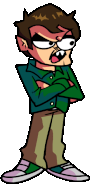 Animated sticker of Tord from Eddsworld, a cartoon character with horns and glasses, standing with arms crossed and mouth open.