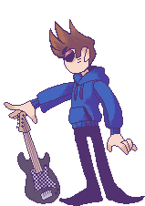 Eddsworld's Tom in pixel art style, wearing his signature blue hoodie and holding a cool black guitar, striking a lead guitarist pose.