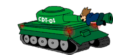 Eddsworld's Tom rides a rapidly spinning green tank, looking dizzy as he holds on for dear life. The tank features 'CDT-01' on its side.