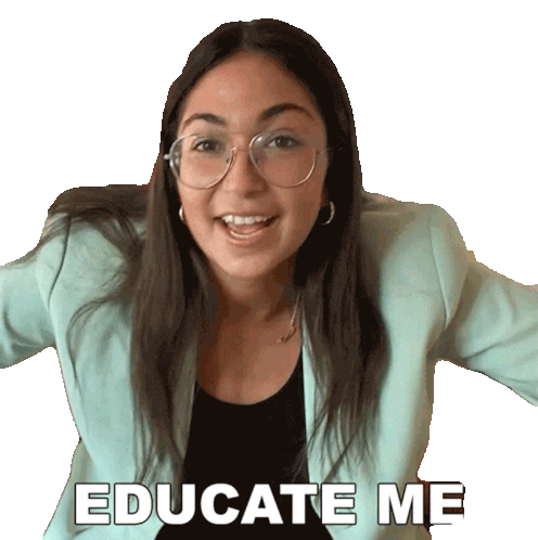 A young woman in glasses and a blazer gestures while saying 'Educate Me,' expressing a desire to learn or be informed.
